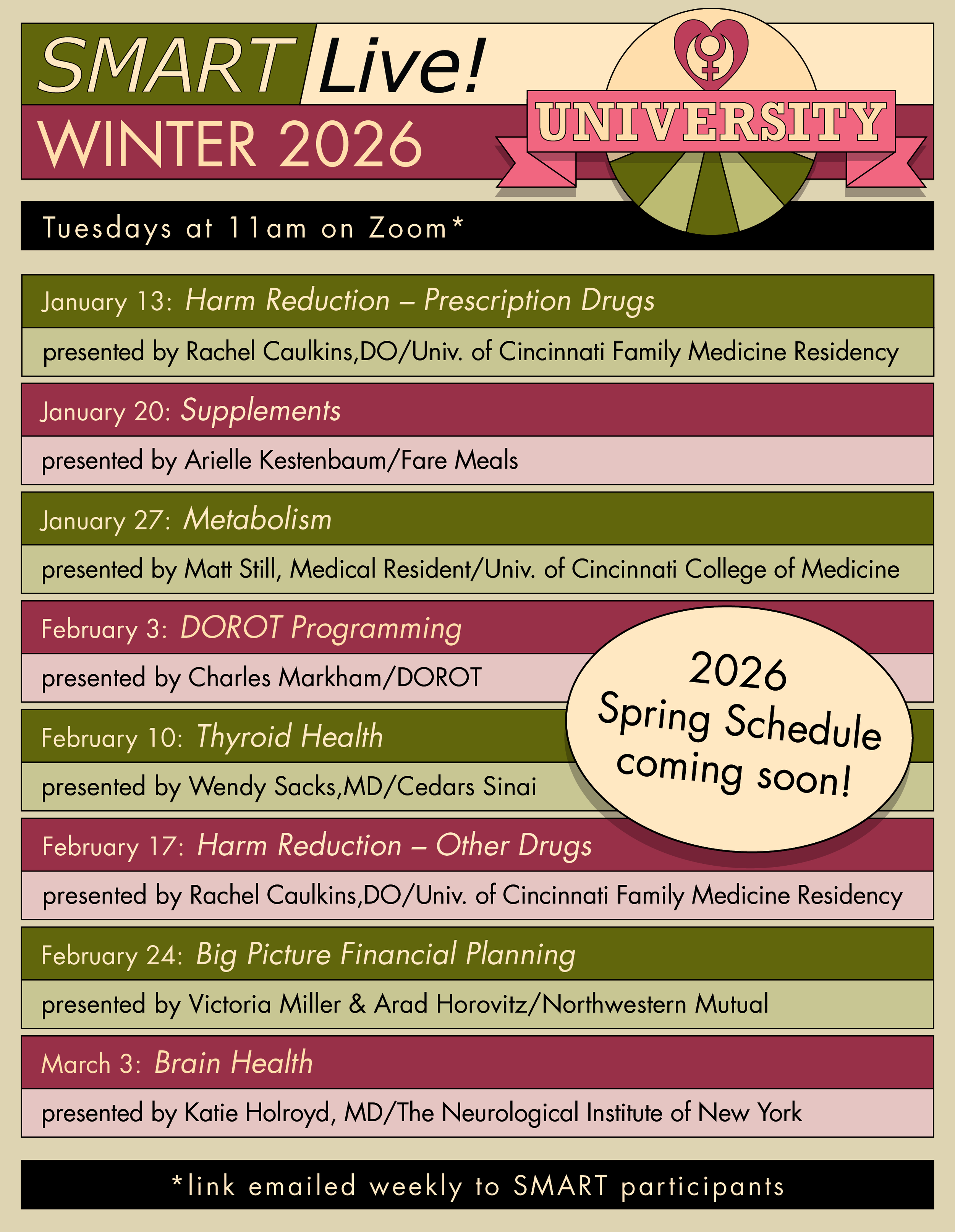 We are continuing to offer SMART Live! University classes through Zoom. SMART Live! University classes are for SMART participants only. If you are an active SMART participant who has completed an intake, the Zoom link will be emailed to you each week of the current session. If you are not a SMART participant (or are a participant and want to review a class) you can view edited versions of our SMART Live! University classes here!